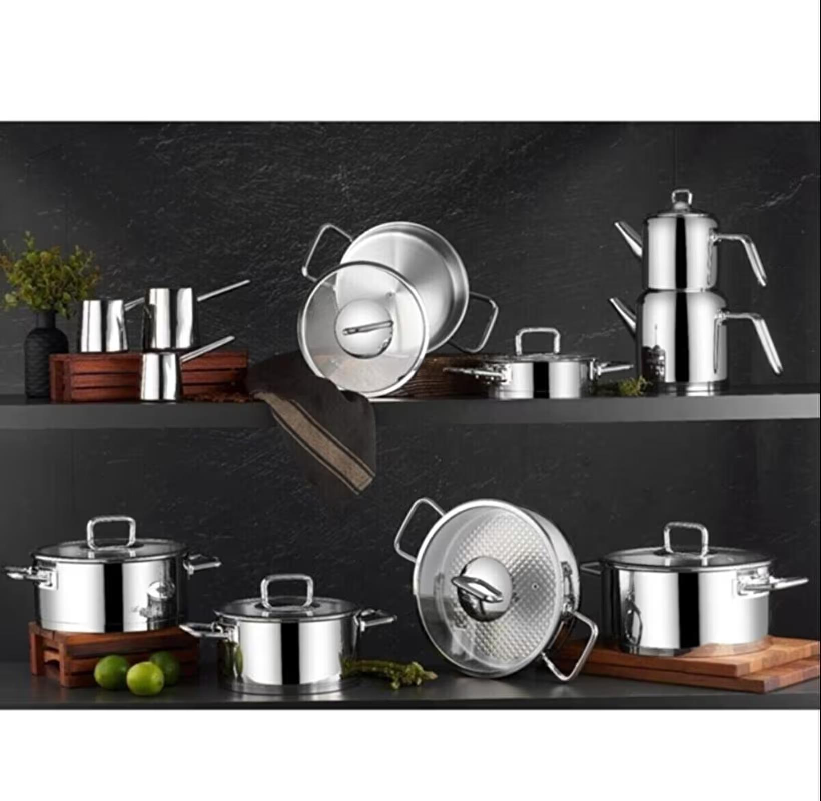 Aryıldız Vento 20 Parça Paslanmaz Çelik Tava ve Tencere Seti, mutfakta ihtiyaç duyduğunuz tüm gereçleri bir arada sunan mükemmel bir settir. Paslanmaz çelik malzemesi ile uzun ömürlü ve dayanıklıdır. Bu set, 20 parçadan oluşarak geniş bir kullanım yelpazesi sunar. Gümüş rengi ile mutfağınıza şıklık katar. İndüksiyon uyumu sayesinde her türlü ocakta rahatlıkla kullanılabilir. İç yüzey kaplaması çelik olan bu set, yemeklerinizi en iyi şekilde pişirmenize yardımcı olur. 12 adet kapak ile birlikte gelen bu set, her türlü pişirme ihtiyacınızı karşılar. ● Setin içinde cezve takımı ve çaydanlık takımı bulunmaktadır.● 20 cm çapında sahan tava ile çeşitli yemekleri kolayca pişirebilirsiniz.● Kapaklı tasarımı sayesinde yemeklerinizin lezzetini ve sıcaklığını korur.